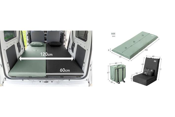『車中泊ソファマットレス』は、長さ180cm×幅60cm(ベッドスタイル)と、多くの車種に対応したサイズになっています。室内幅120cm以上の車種であれば、2つ並べることができます。