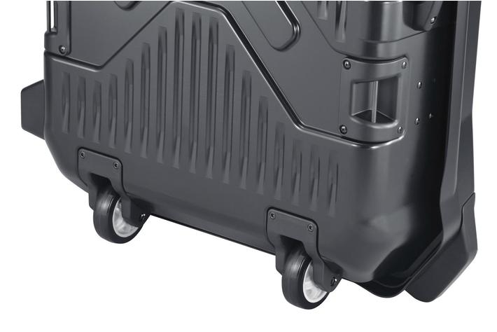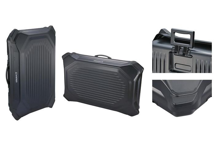 これまでの流線型ルーフボックスとは異なり、ヘビーデューティなスーツケースやアウトドアギアをイメージしたデザイン。キャリー用ハンドルは、走行中の汚れが付かないよう車載時は折りたためる仕様に。取り外して運ぶ際、ぶつけやすい角は強度を上げ、縦置き横置きに自立するスタンドも装備しました。