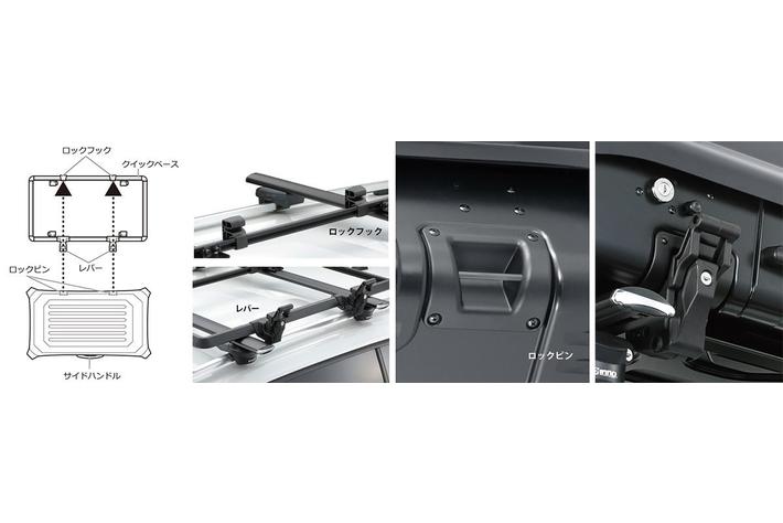 ギアキャリーをカーサイドから車上に載せて水平にスライドし、ギアキャリーの「ロックピン」をクイックベースの「ロックフック」に押し込みます。クイックベースの「レバー」を立ち上げて「ロックピン」に引っ掛け、鍵をかければ積載完了です。