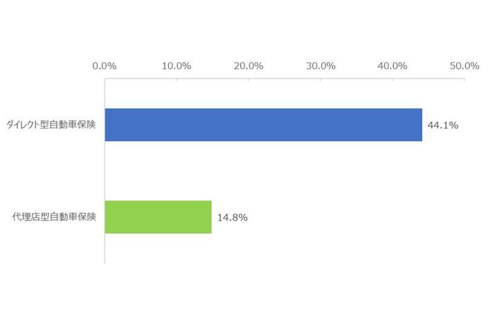 契約している自動車保険会社からの、メールマガジンやマイページ、公式アプリ、SNSによる情報の受け取りについて調査したところ、ダイレクト型自動車保険では44.1%の契約者が情報提供を受けていると回答し、代理店型自動車保険(14.8%)と比べて非常に高い結果となりました。