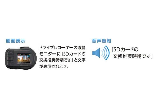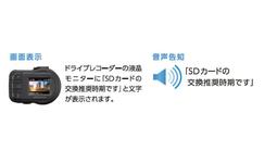 本商品との連携が可能な当社製ドライブレコーダー※で使用することにより、SDカードの交換時期を画面表示や音声で知らせる「SDカード寿命告知機能」に対応。SDカードの寿命による録画エラーを未然に防止します。