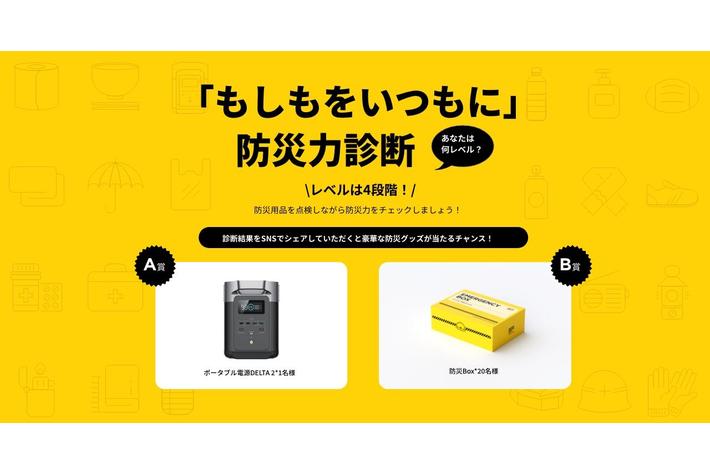 EcoFlow公式サイトにて「SNS防災力診断キャンペーン」を開催します。防災力診断ページでは、ご家庭にある防災用品を点検しながら、防災力レベルをチェックすることができます。また、 診断結果をSNSでシェアしていただいた方の中から、抽選で21名様に「DELTA 2」または「EcoFlowオリジナル防災ボックス」が当たります。