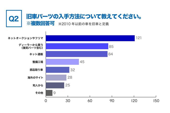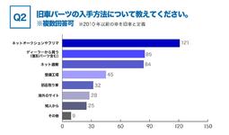 旧車乗りに旧車パーツの入手方法について聞いてみると、最も多い回答を集めたのが「ネットオークションやフリマ」で121票でした。