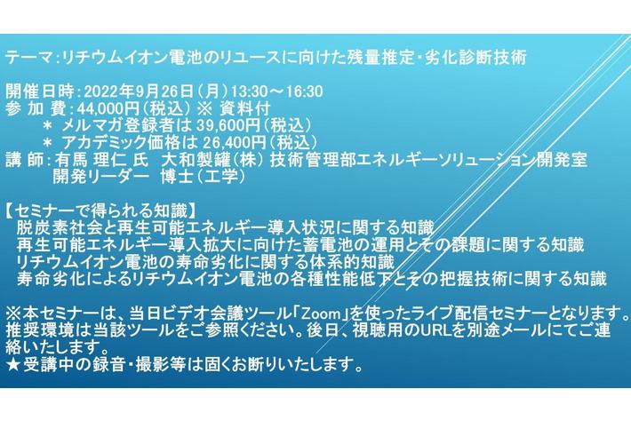 先端技術情報や市場情報を提供している(株)シーエムシー・リサーチ(千代田区神田錦町: https://cmcre.com/ )では、 各種材料・化学品などの市場動向・技術動向のセミナーや書籍発行を行っておりますが、 このたび「リチウムイオン電池のリユースに向けた残量推定・劣化診断技術」と題するセミナーを、 講師に有馬 理仁 氏 大和製罐(株) 技術管理部エネルギーソリューション開発室 開発リーダー 博士(工学))をお迎えし、2022年9月26日(月)13:30より、 ZOOMを利用したライブ配信で開催いたします。 受講料は、 一般:44,000円(税込)、 弊社メルマガ会員:39,600円(税込)、 アカデミック価格は26,400円(税込)となっております(資料付)。