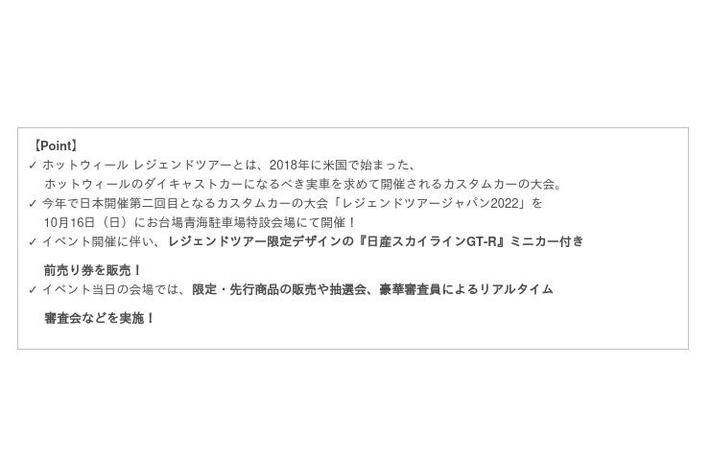 世界大手の玩具メーカー、米国マテル社の日本法人であるマテル・インターナショナル株式会社(本社:東京都千代田区、代表取締役社長:マーク・パンサール)は、世界No.1のミニカーブランド「ホットウィール」のダイキャストカーになるべき実車を決定する、カスタムカーの大会『レジェンドツアー ジャパン2022』を10月16日(日)にお台場青海駐車場特設会場にて開催します。それに伴い、限定デザイン『日産スカイラインGT-R』ミニカー付き前売り券を、9月16日(金)10時より発売開始いたします。イベント当日の会場では、限定・先行商品の販売や、非売品のミニカーが当たる抽選会なども実施いたします。