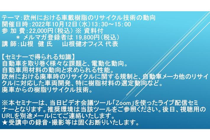 先端技術情報や市場情報を提供している(株)シーエムシー・リサーチ(千代田区神田錦町: https://cmcre.com/ )では、 各種材料・化学品などの市場動向・技術動向のセミナーや書籍発行を行っておりますが、 このたび「欧州における車載樹脂のリサイクル技術の動向」と題するセミナーを、 講師に山根 健 氏 山根健オフィス 代表)をお迎えし、2022年10月12日(水)13:30より、 ZOOMを利用したライブ配信で開催いたします。 受講料は、 一般:22,000円(税込)、 弊社メルマガ会員:19,800円(税込)となっております(資料付)。