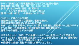先端技術情報や市場情報を提供している(株)シーエムシー・リサーチ(千代田区神田錦町: https://cmcre.com/ )では、 各種材料・化学品などの市場動向・技術動向のセミナーや書籍発行を行っておりますが、 このたび「欧州における車載樹脂のリサイクル技術の動向」と題するセミナーを、 講師に山根 健 氏 山根健オフィス 代表)をお迎えし、2022年10月12日(水)13:30より、 ZOOMを利用したライブ配信で開催いたします。 受講料は、 一般:22,000円(税込)、 弊社メルマガ会員:19,800円(税込)となっております(資料付)。
