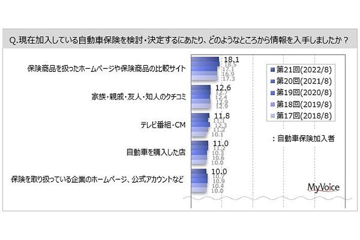 自動車保険加入時に参考にした情報源は(複数回答)、「保険商品を扱ったホームページや保険商品の比較サイト」が加入者の18.1%、「家族・親戚・友人・知人のクチコミ」「テレビ番組・CM」「自動車を購入した店」が各1割強です。