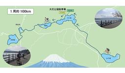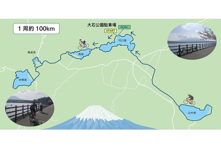 ステーション出発→大石公園駐車場(車で約1時間30分:約80km)→サイクリング(富士五湖を1周。5時間程度:約100km)→大石公園駐車場→ステーション着。