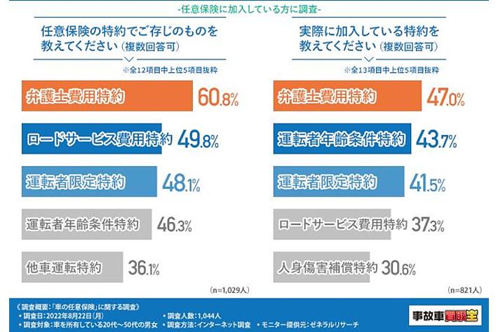 そこで、「任意保険の特約でご存じのものを教えてください(複数回答可)」と質問したところ、 『弁護士費用特約(60.8%)』と回答した方が最も多く、次いで 『ロードサービス費用特約(49.8%)』『運転者限定特約(48.1%)』と続きました。