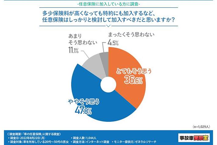 そこで、「多少保険料が高くなっても特約にも加入するなど、任意保険はしっかりと検討して加入すべきだと思いますか?」と質問したところ、8割以上の方が 『とてもそう思う(36.6%)』『ややそう思う(47.8%)』と回答しました。