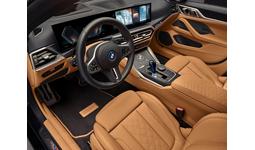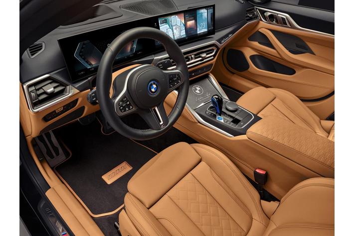 BMW i4 M50 by Kithのインテリアも、特にキャラメル・カラーの調和がとれたコーディネートになっている。ニー・ボルスター、ステアリング・コラム、シート、サイド・パネル、AポストおよびBポスト下部は、すべてメリノ・レザーで仕上げられている。また、前後のフロア・マットはキャラメル・カラーのレザーで縁取られ、Kithに変更されたMロゴとMストライプの刺繍が施されている。ヘッドレストとフロント・センター・アームレストには、ボックス・デザインのKithの文字がエンボス加工されている。また、「KITH Exclusive Edition」の文字がトリムにレーザーで刻印されている。