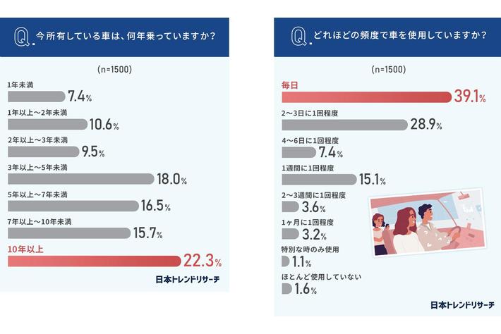 まずは、今所有している車は何年乗っているか、現在どれほどの頻度で車を使用しているかについて聞きました。