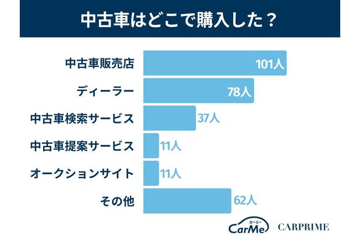 新車ではディーラーが人気なものの、中古車ではディーラーに高い人気があるというわけでもないようです。とはいえ、ディーラーで中古車を購入した方は78名(26%)で中古車販売店に次ぐ多さでした。