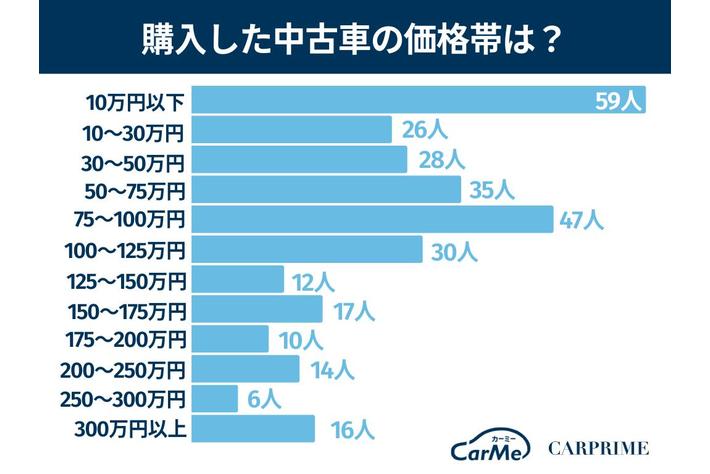 購入した中古車の価格帯は10万円以下が59票(19.7%)を集め、最多という結果になりました。中古車はとにかく安いことを重視する人も多いことがわかります。