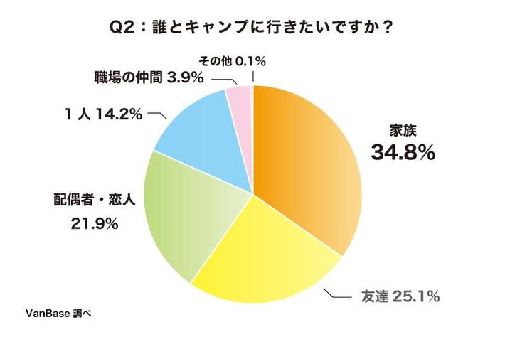 Q1でキャンプが「好き」と回答した人に、誰とキャンプに行きたいかを聞いたところ、最も多かったのは「家族」で34.8%でした。続いて「友達」と回答した人が25.1%、「配偶者・恋人」と回答した人が21.9%という結果になりました。近年は1人時間を楽しむソロキャンプの人気が高まっていることもあり、「1人」と回答する人も14.2%いることがわかりました。