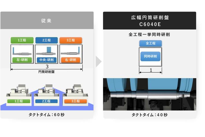 従来は研削全工程に円筒研削盤を3台要しますが、C6040Eは全工程を一挙に同時研削でき、設備台数1台で完結します。生産ライン長最大70%短縮を実現し、導入コスト低減にも寄与します。
