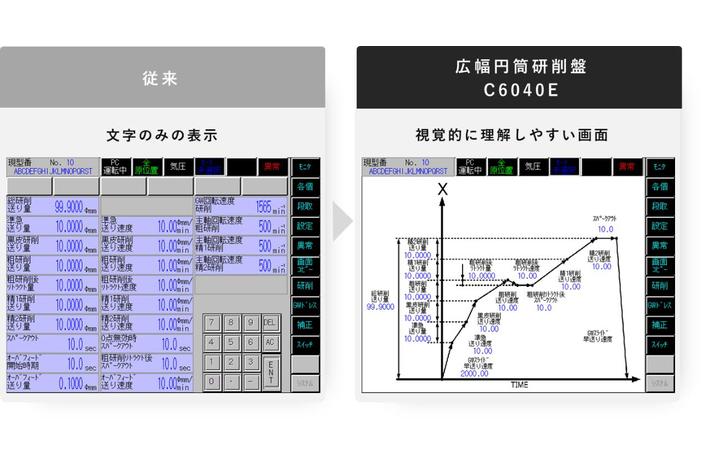 従来は文字のみが表示される入力画面でしたが、C6040Eは加工サイクルを視覚的に感じ取れる理解しやすい操作画面を採用しました。
