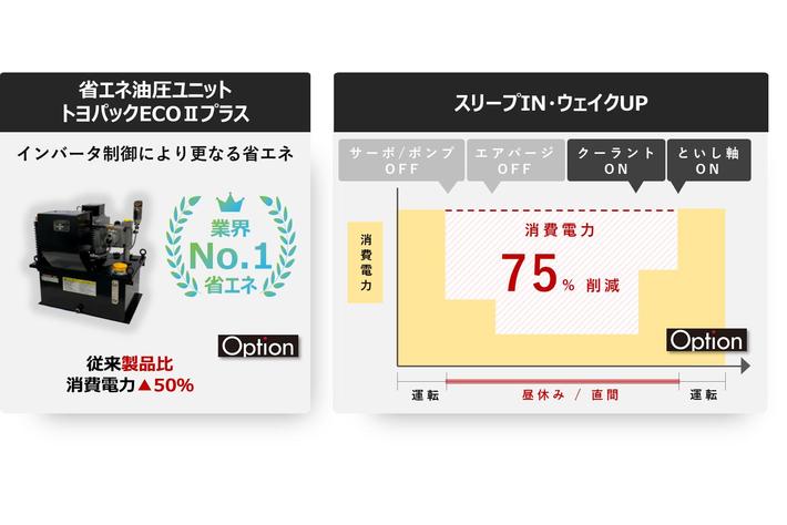 スリープIN・ウェイクUP機能により、非加工時間の消費電力を最大75%削減します。また、ジェイテクトフルードパワーシステム製の省エネ油圧ユニット「トヨパックECOIIプラス」は、インバータ制御により消費電力従来比50%削減を達成しました。これらの消費電力削減効果により、CO2排出量を最大3t/年削減します。