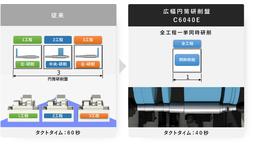 従来は研削全工程に円筒研削盤を3台要しますが、C6040Eは全工程を一挙に同時研削でき、設備台数1台で完結します。生産ライン長最大70%短縮を実現し、導入コスト低減にも寄与します。
