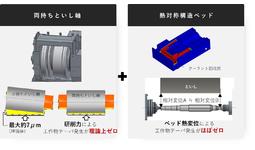 ジェイテクトマシンシステムが有する高剛性の両持ち式構造のといし軸は研削力によるテーパ発生を理論上ゼロに抑えます。また、熱対称構造ベッドは温度変化によるテーパ発生をほぼゼロに抑制します。これらの技術を用いて工作物全幅で安定した寸法精度を確保します。