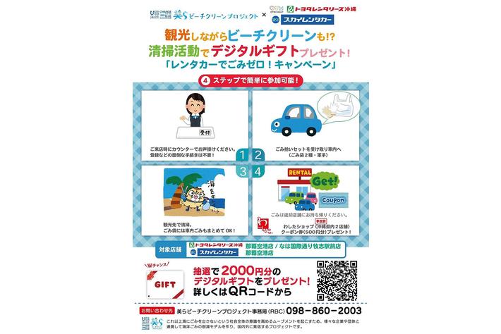 美らビーチクリーンプロジェクト実行委員会は、7月下旬から沖縄県内のレンタカー企業と連携した取り組みの第1弾として「レンタカーでごみゼロ!キャンペーン」をトヨタレンタリース沖縄の2店舗で実施しております。この度、10月24日から第2弾(2社目)として、スカイレンタリース株式会社と連携したキャンペーンを開始しました。