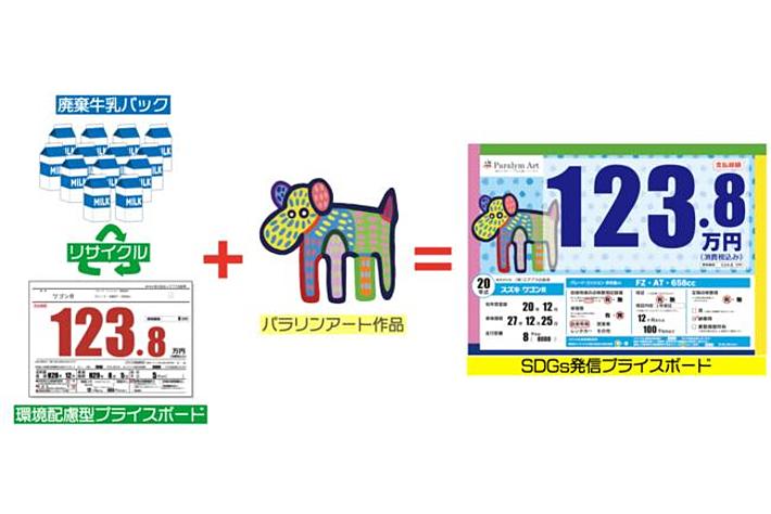 自動車公正競争規約改正に伴い、中古車の「支払総額」表示義務化が2023年10月に施行されます。それに合わせてプライスボードの項目内容において規約改正に合わせた適切な表記が求められます。それを見据えて規約改正に対応したプライス作成システム「エアプラ」のプロモーション展開のため、地球環境に優しい牛乳パックでつくられたプライスボード(ミルクパネル)をトライアル申し込みいただいた販売代理店に提供されます。プライスボードのデザインにはパラリンアート作品を採用いただき、環境保護とSDGsを意識した自動車業界では初の取り組み※となります。