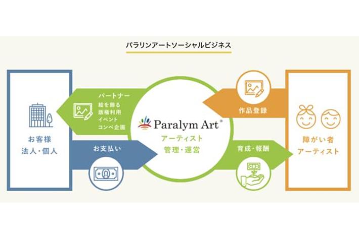 パラリンアートは「障がい者がアートで夢を叶える世界」の実現を目指し、社会保障費に依存せず、民間企業と個人の協力で障がい者支援を継続できる社会貢献型事業を行っています。障がい者の多くは、社会参加への周囲の理解の少なさや、金銭的困窮などの課題を抱えており、これらの課題を解決するための仕組みは依然として不足しているのが現状です。パラリンアートは、障がい者アーティストの作品(絵画・デザイン等)をさまざまな企業・団体にアート利用してもらうための橋渡しの役割を担い、障がい者が持つ才能をひろく世間に発信するとともに、採用されたアーティストや障がい者施設へ報酬を支払うことで、彼らの社会参加と経済的自立を推進しています。