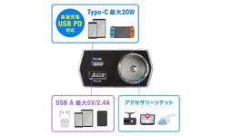 USB Type-Cポートは最大20WまでのUSB Power Delivery出力に対応し、PD充電に対応するスマホ、タブレットに最大12Vの高出力で急速充電ができます。USB Aポートは、最大5V/2.4Aまでの出力が可能で、接続機器を自動認識し、機器に合わせた最大出力で充電が行えます。