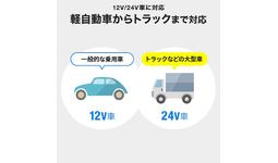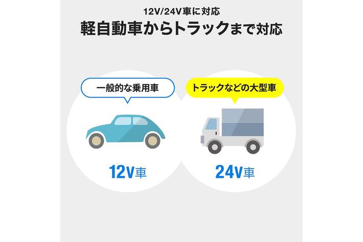 12V/24V入力に対応し、普通車はもちろん、トラックなどの大型車でも使用できます。