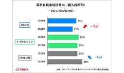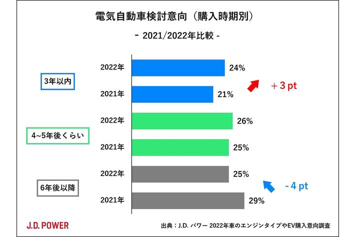 EVに着目すると、3年以内のケースでは24%で、2021年と比較すると+3ポイントとなっています。6年後以降のケースもほぼ同水準の25%でしたが、2021年と比較すると-4ポイントとなっています。