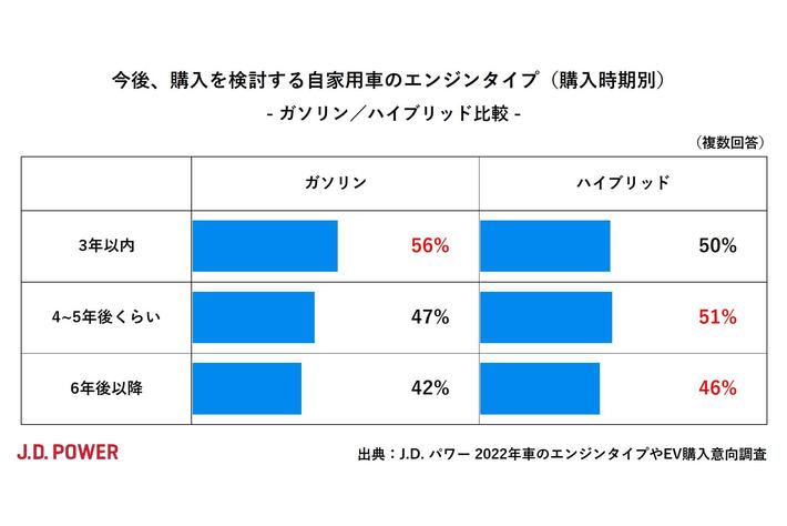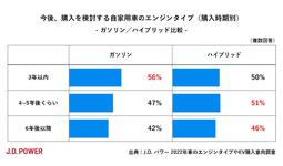 次に車の購入予定時期別に見てみましょう。3年以内のケースでは、ガソリン車が56%、ハイブリッド車が50%と、ガソリン車が上回っていますが、 4~5年後くらい、6年後以降ではハイブリッド車がガソリン車を上回っています。購入時期が近いケースではガソリン車、4~5年後くらいを境にして、ハイブリッド車がより検討される傾向が表れています。