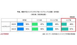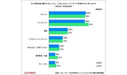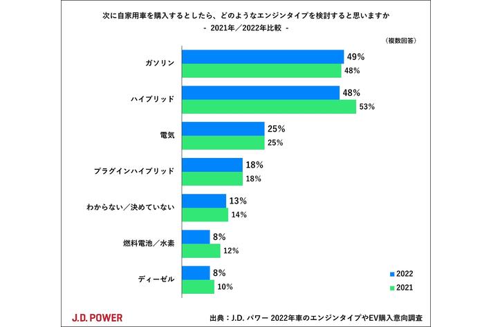 2021年調査と比較すると、トップだったハイブリッド車の検討意向が低下して、今回はガソリン車がトップとなりました。