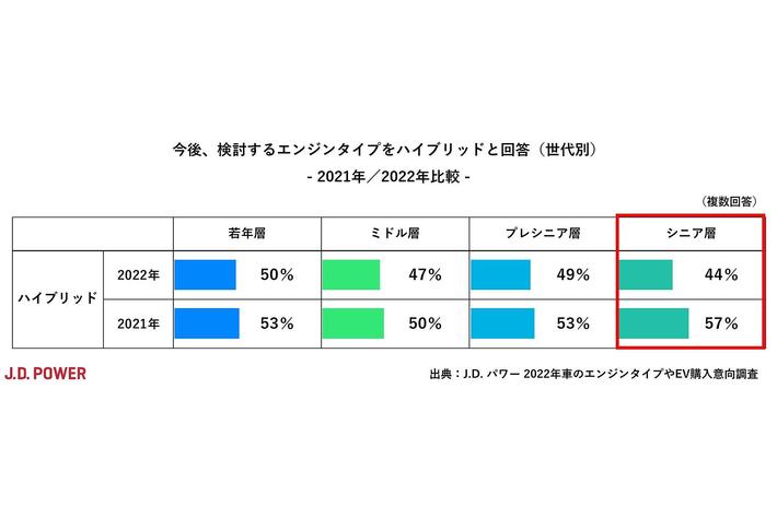 次に世代別に見てみましょう。ハイブリッド車の購入検討意向は2021年と比較すると、どの世代でも減っており、特にシニア層で、57%から44%と-13ポイントも減少していることがわかります。
