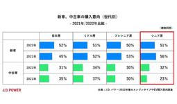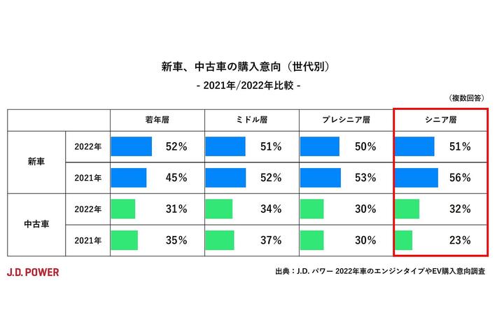 シニア層で新車の購入を検討する割合は、2021年の56%から51%に減少し、反対に中古車は2021年の23%から32%に増加しています。
