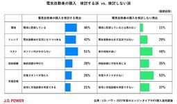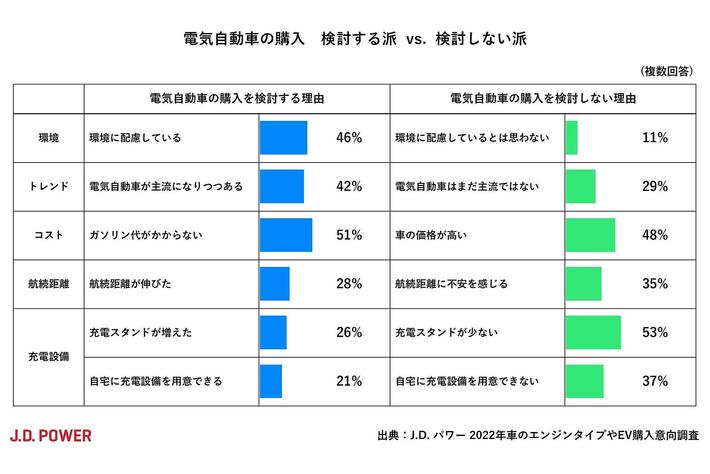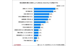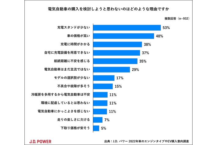 EV購入を検討しない理由トップ2は、「充電スタンドが少ない」(53%)、「車の価格が高い」(48%)