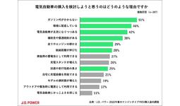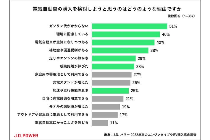 EV購入検討の理由トップ2は、「ガソリン代がかからない」(51%)、「環境に配慮している」(46%)