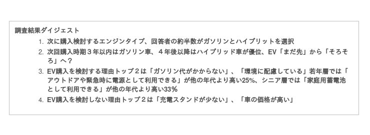 本調査では、次回購入検討する車として2人に1人の消費者がガソリン車やハイブリッド車を考えており、全体としてみればまだまだEVは主流になっていないことが分かりました。