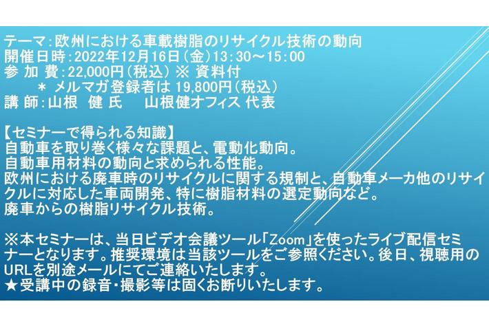 【ライブ配信セミナー】欧州における車載樹脂のリサイクル技術の動向 12月16日(金)開催 主催:(株)シーエムシー・リサーチ