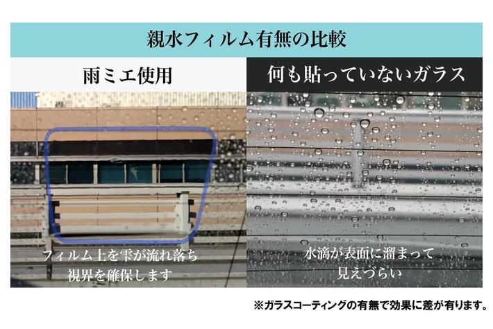 ナノ親水防曇コーティングの特殊フィルムを貼るだけで、水滴が平坦化し、雨天時のドラレコやミラーの視界をしっかり確保します。何も貼ってない状態と比較しても一目瞭然です!