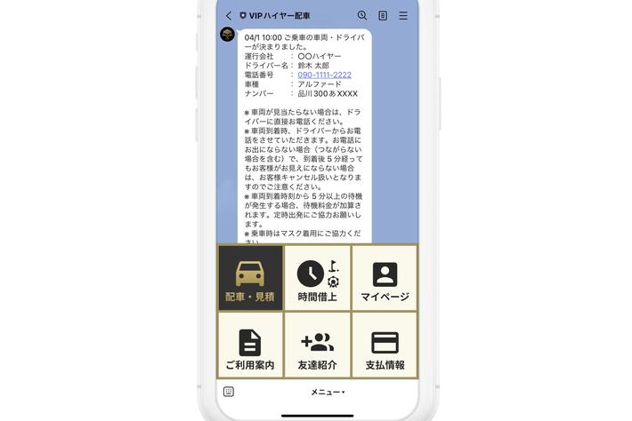 VIPハイヤー配車は、専用アプリをインストールすることなく、LINE公式アカウントから手軽にハイヤーを呼ぶことができます。