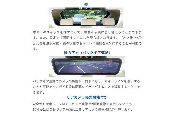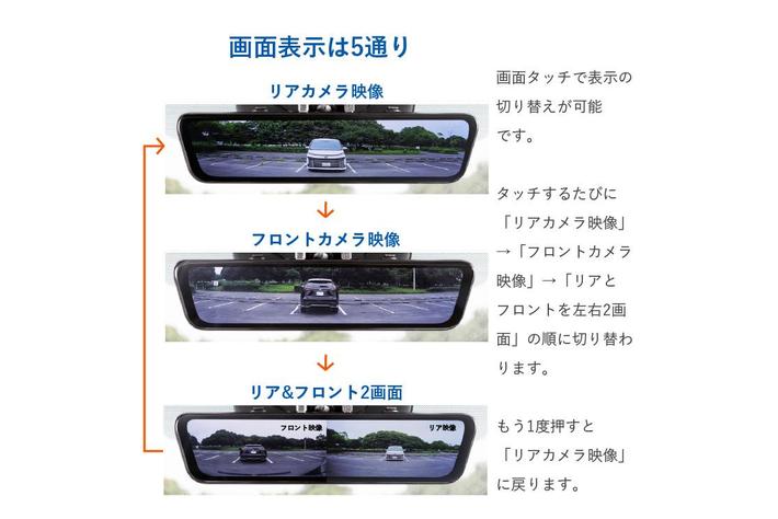 画面表示はリアカメラ映像の他にフロント映像やフロントとリアの2画面表示も可能です。 また通常の鏡としても利用しながらの録画も可能なので、状況に応じて画面切替していただけます。 また運転中の操作は危険なため音声操作を利用して画面切替もできる機能も搭載しています。