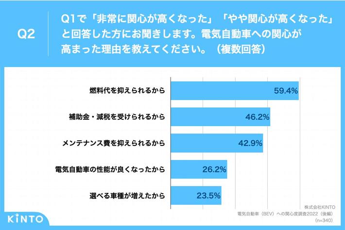 Q2. 電気自動車への関心が高まる理由として、約半数から「燃料代を抑えられる」や「補助金・減税を受けられる」との声