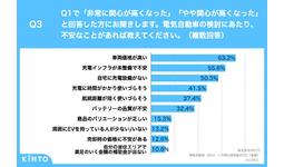 Q1で「非常に関心が高くなった」「やや関心が高くなった」と回答した方に、電気自動車の検討にあたり不安なことを尋ねたところ、「車両価格が高い」が63.2%、「充電インフラが未整備で不安」が55.6%、「自宅に充電設備がない」が50.3%という回答となりました。