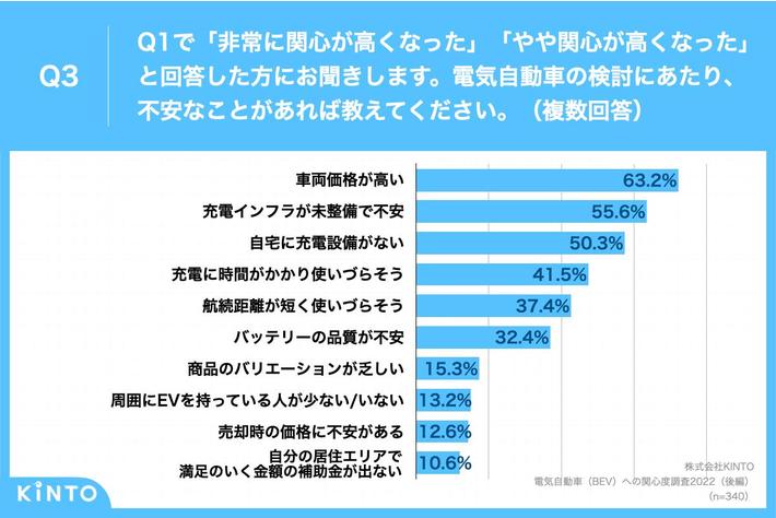 Q3. 電気自動車に興味はあるものの不安なこと、「車両価格が高い」が63.2%で最多