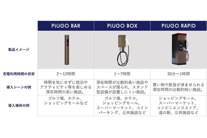 これに伴い、プラゴでは従来製品の最大4kW出力の普通充電器「PLUGO BAR(プラゴ バー)」、最大50kW出力の急速充電器「PLUGO RAPID(プラゴ ラピッド)」と合わせた3種類の充電器を提供。それぞれの充電速度や設置方法の特長を生かし、施設に応じた設置を図ります。