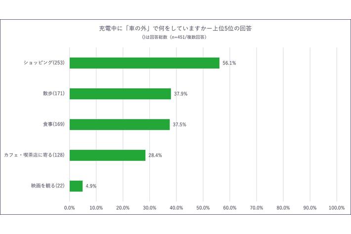 ※2 2022年8月19日~8月31日EVSmart/プラゴ共同WEBアンケート(回答総数547)より。自宅外以外の充電ステーションを使用するBEVおよびPHEVユーザー(n=451)のうち、充電中の車外での過ごし方として最も多かった回答の上位5位(複数回答可)