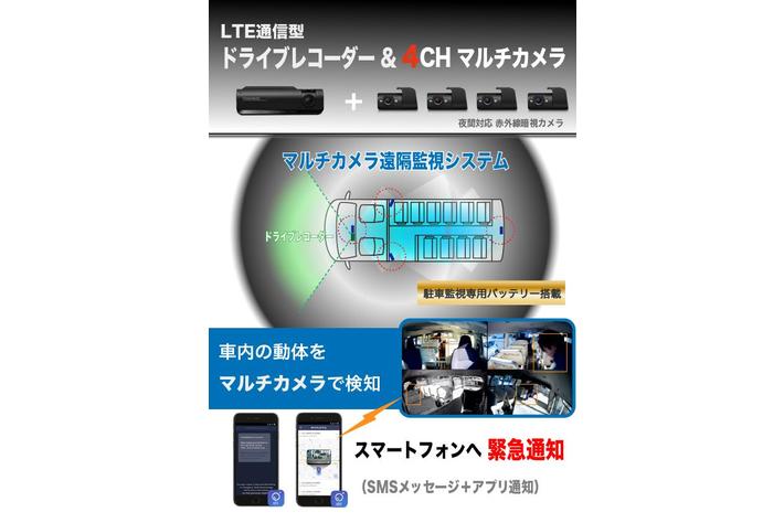 本製品は、送迎用バス内の園児や乗客を検知ができる4つの赤外線カメラを備えており、4G通信によってスマートフォンにバス車内写真や緊急SMSメッセージを送信することができます。