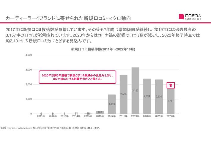 2017年に新規口コミ投稿数が急増しています。その後も2年間は増加傾向が継続し、2019年には過去最高の3,157件の口コミが投稿されています。2020年からはコロナ禍の影響で口コミ数が減少し、2022年終了時点では約2,101件の新規口コミ数にとどまる見込みです。