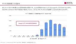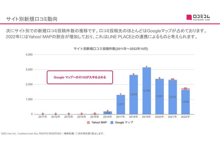 次にサイト別での新規口コミ投稿件数の推移です。口コミ投稿先のほとんどはGoogleマップが占めております。2022年にはYahoo! MAPの割合が増加しており、これはLINE PLACEとの連携によるものと考えられます。